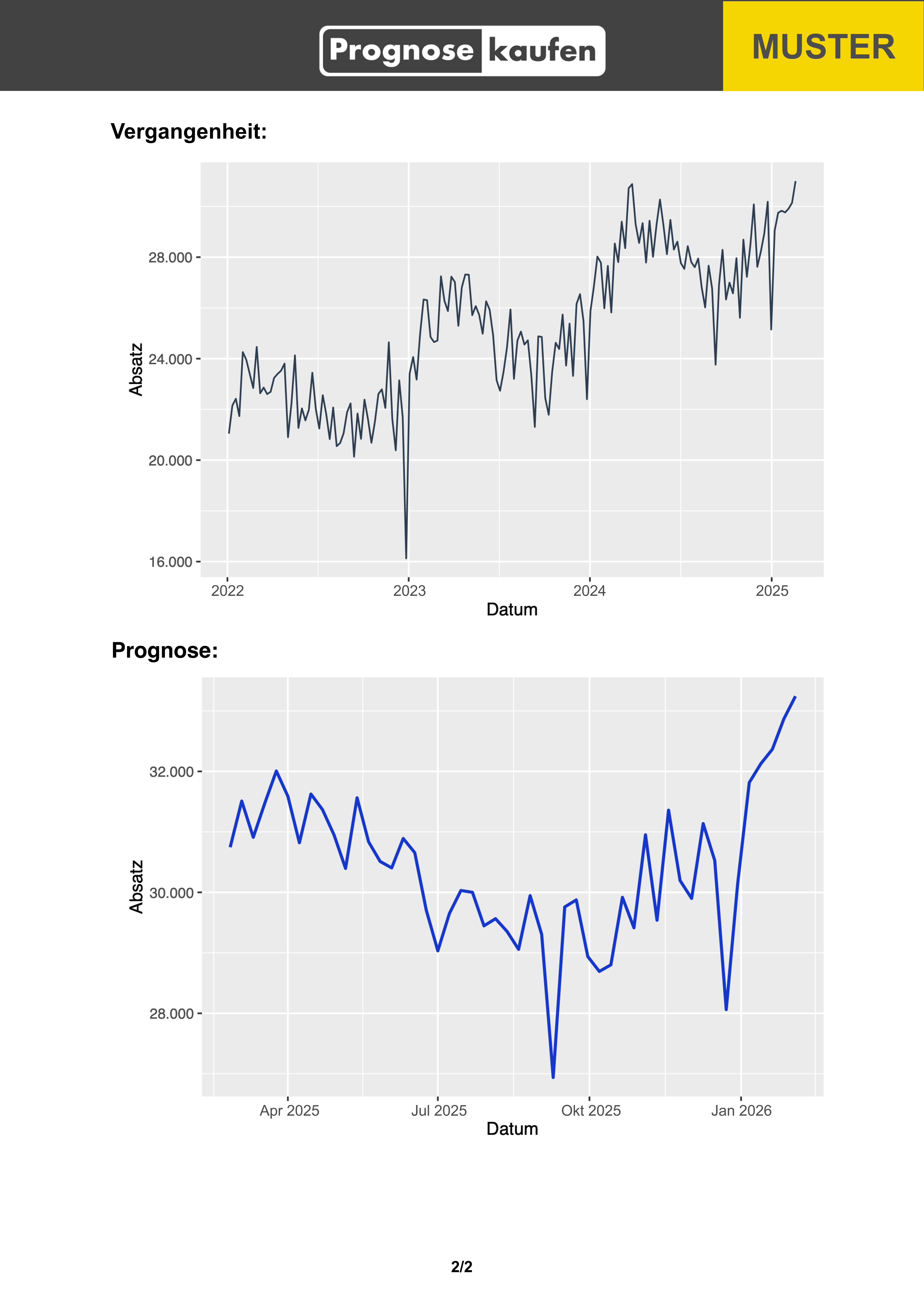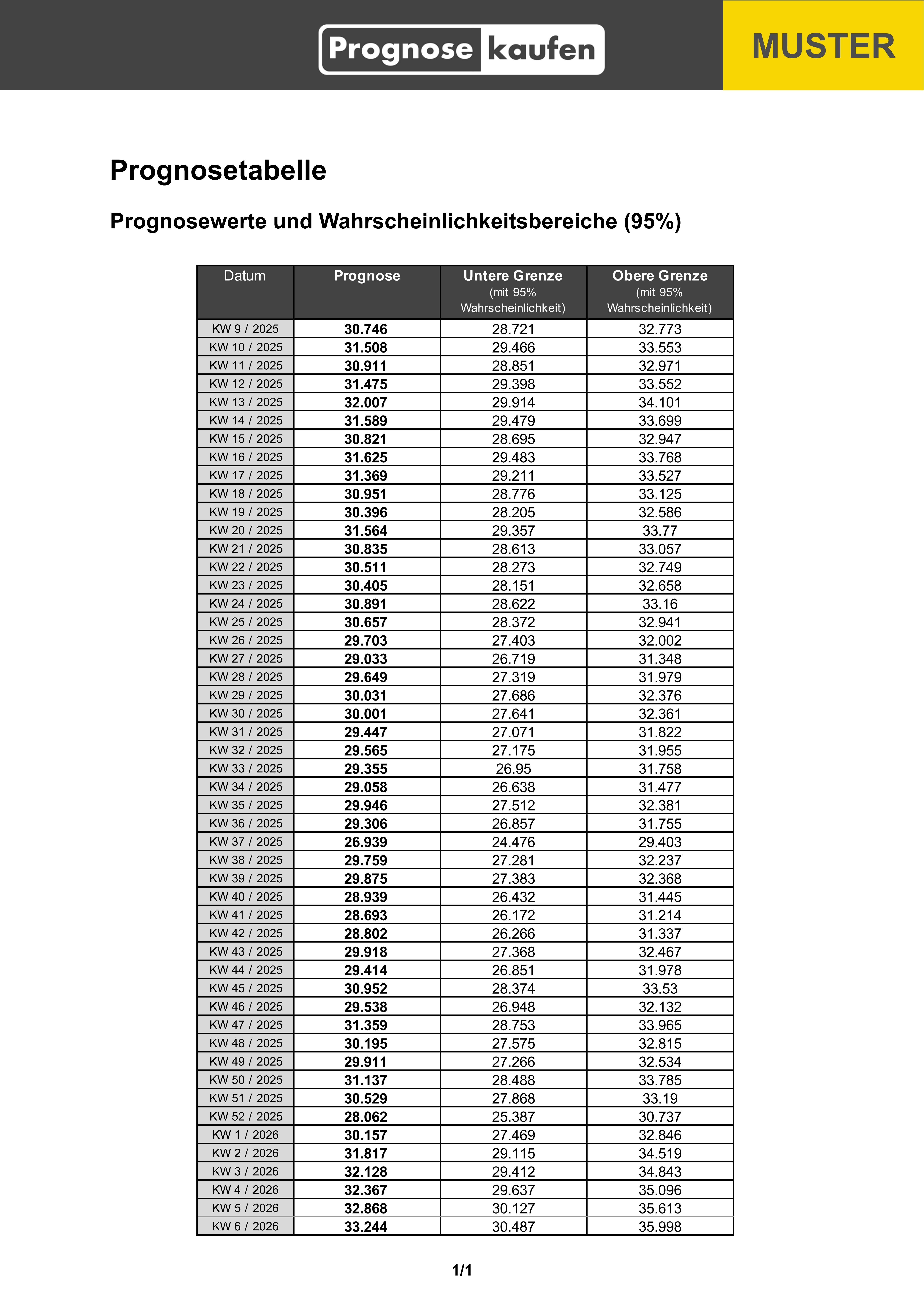 Ihre Prognose erhalten Sie grafisch (PDF) aufbereitet mit Wahrscheinlichkeitsbereichen und Detailansichten sowie und tabellarisch (Excel).